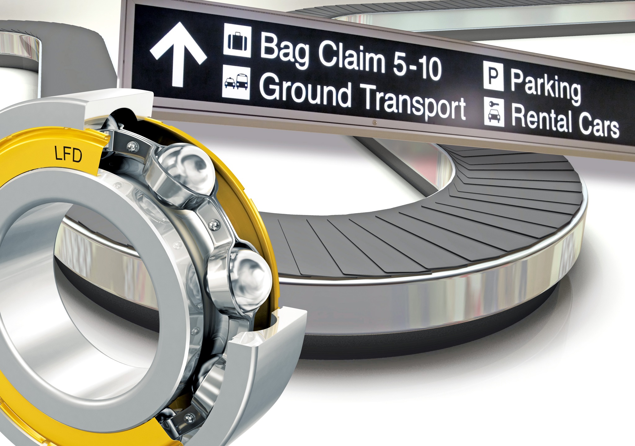 Anlagen für den Fluggepäcktransport laufen rund um die Uhr ohne Unterbrechung durch und müssen möglichst wartungsfrei und zuverlässig ihren Dienst tun. Die Transportrollenbänder sind mittlerweile auf einen Gepäcktransport von bis zu 10 m/s ausgelegt. Ein störungsfreier Ablauf ist daher nur mit qualitativ hochwertigen Lagern und entsprechenden Leichtlaufeigenschaften zu gewährleisten. LFD-Lager haben bei den entsprechenden Tests alle Voraussetzungen einwandfrei bestanden und werden daher weltweit im Fluggepäcktransport eingesetzt.